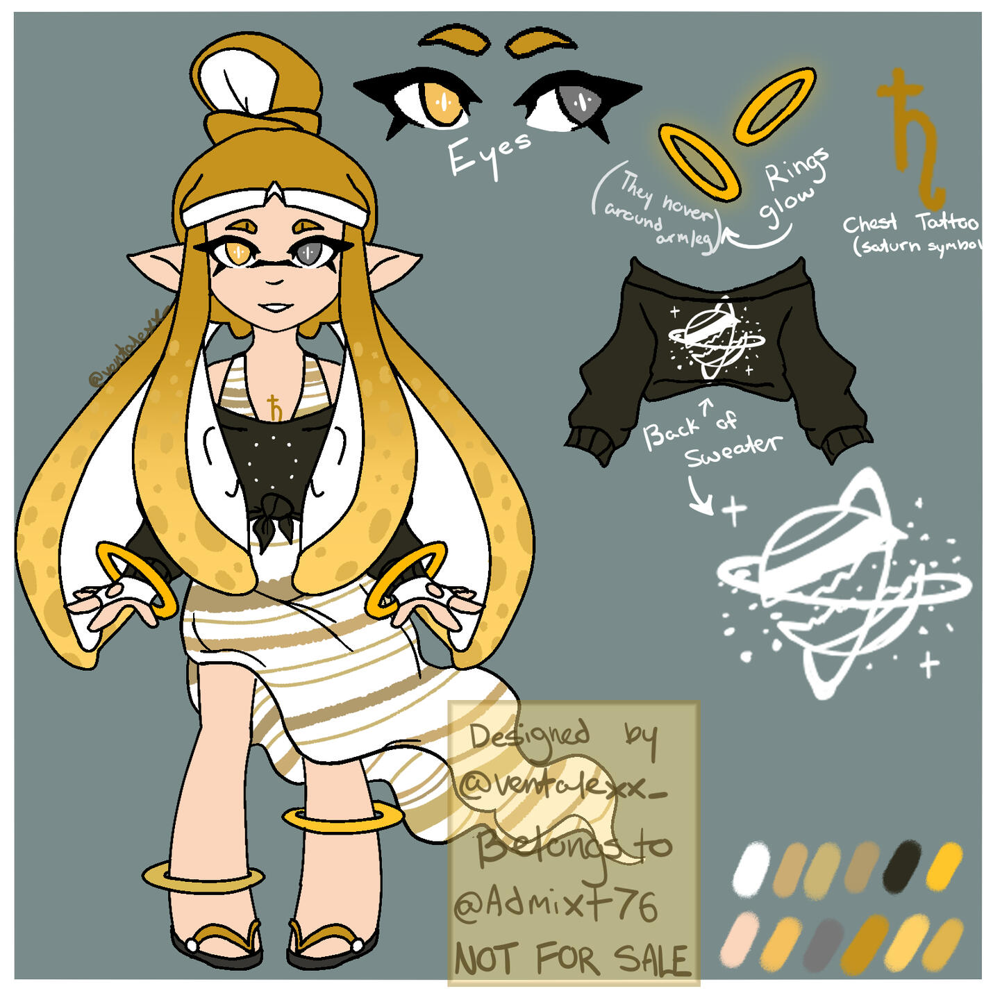 I also offer custom character designs! You can give me a theme or idea of what you want to see in a character, and I will design one for your future use. Not limited to just splatoon!Here is a previous custom design I was commissioned for. Other examples can be found on my old toyhouse account (@ventalexx)